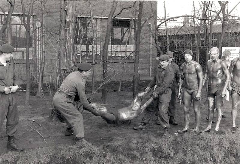 - Vervolgens verzamelen bij een stuk open terrein. Hier werden wij van top tot teen ingesmeerd met legergroene blanco. Smerig vet spul; normaal in gebruik om koppelriem in te vetten en te laten glimmen. Bijna niet met zeep te verwijderen. Kruipend over een zanderig terreingedeelte met vooral het lichaam laag tegen de grond. Hiertoe aangemoedigd door de oude hap. Het zand plakte en schuurde aan alle kanten. Vervolgens kruipend achter elkaar door een smalle afvoersloot